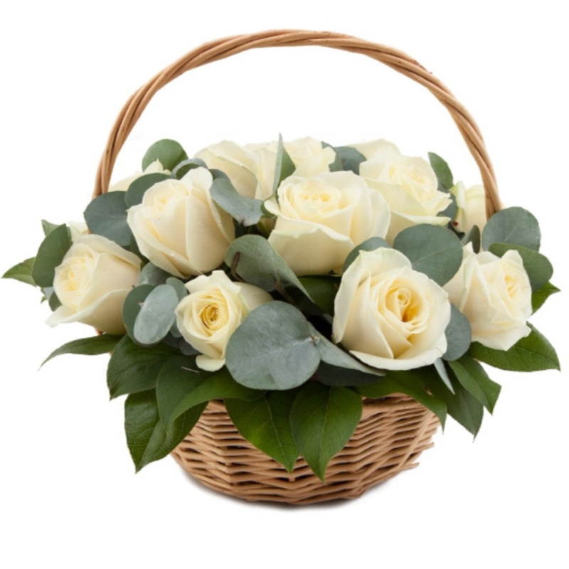 15 белых роз, салас, эвкалипт, корзина, оазис.